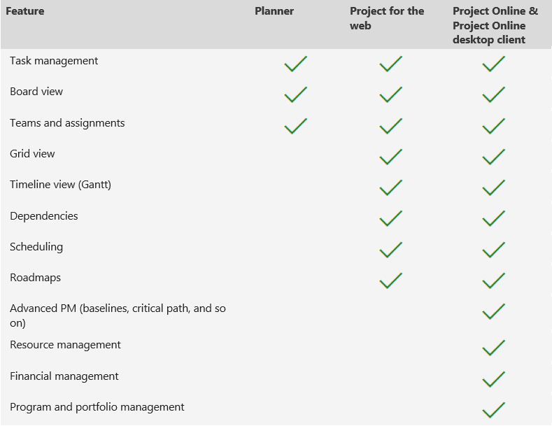 Below is a summary of the features and functionalities of Planner, Project for the web, and the Project Online web and desktop applications: