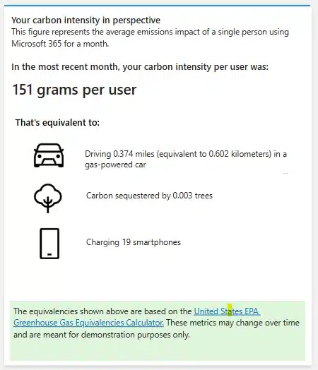 According to the Greenhouse Gas Equivalencies Calculator | US EPA calculation method used to calculate the carbon footprint of Microsoft 365 cloud services, one of our employees contributes 151 g of carbon equivalent per month.
