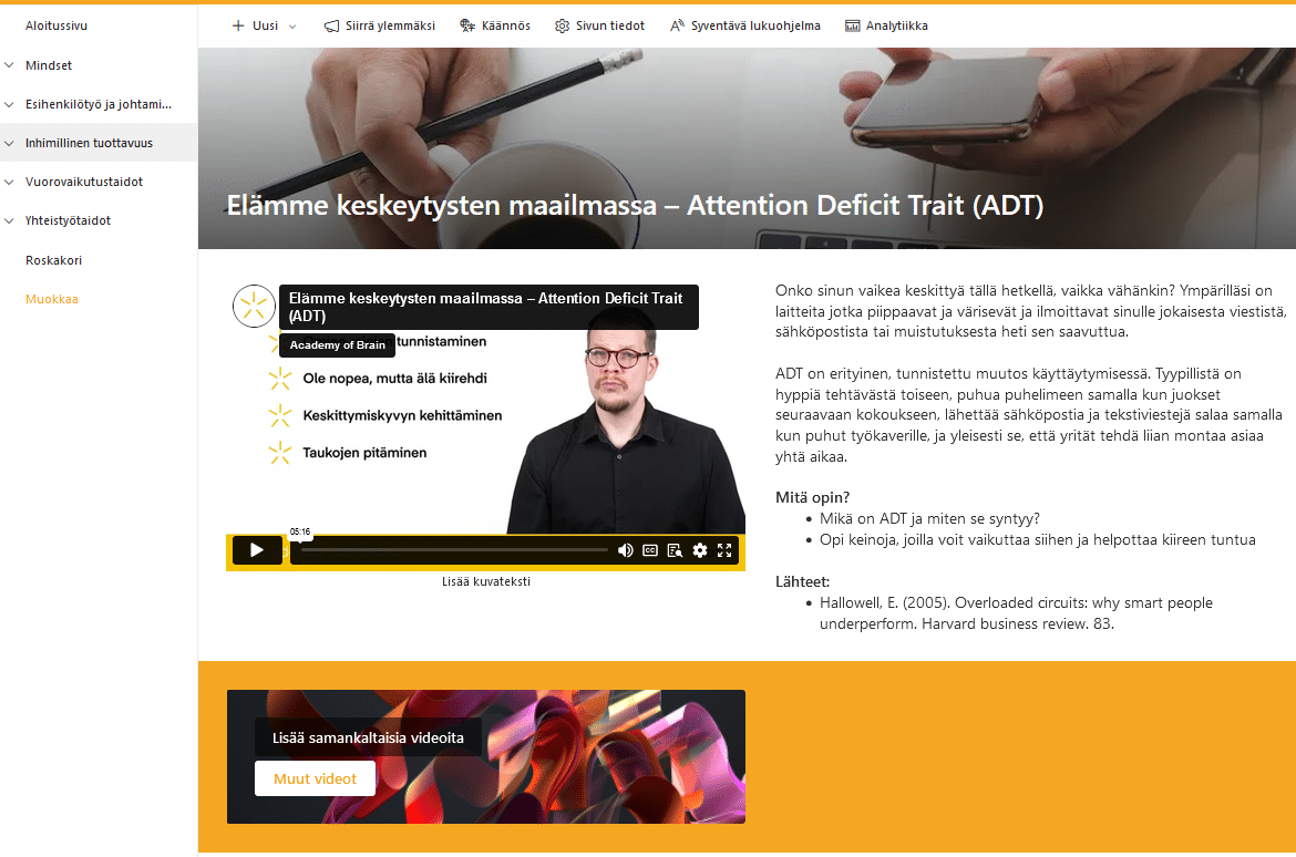 o Sovellus auttaa käyttäjiä selaamaan, seuraamaan ja jakamaan laajaa sisältövalikoimaa kattavista kokonaisuuksista yksittäisiin oppimissisältöihin. - Työkalu tukee työntekijöitä muodollisessa ja epämuodollisessa oppimisessa juuri silloin, kun sitä tarvitaan, helpottaen työntekijöiden oppimista joustavasti työn tekemisen lomassa.