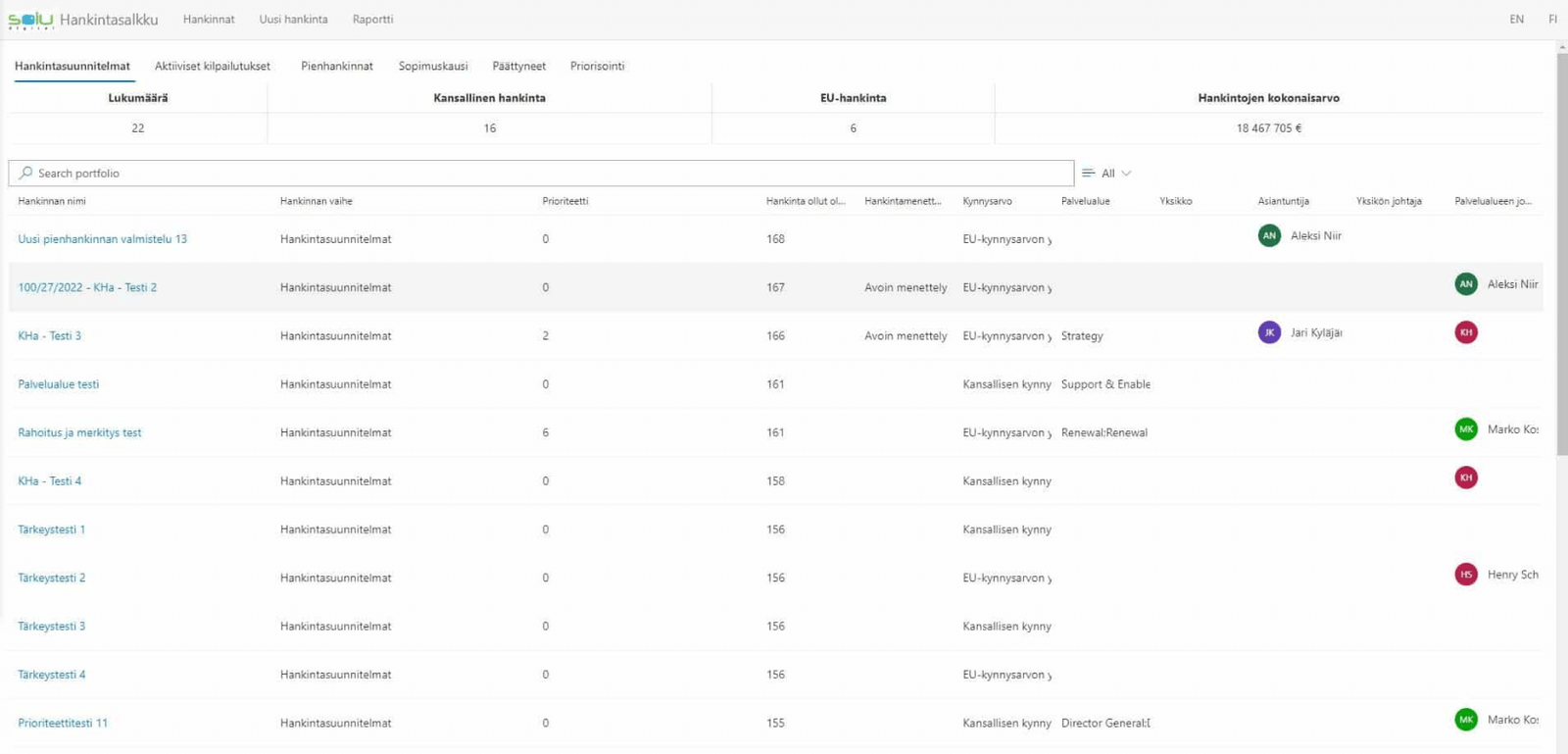 - Koontinäkymä kaikista hankinnoista erilaisin suodatusmäärittein